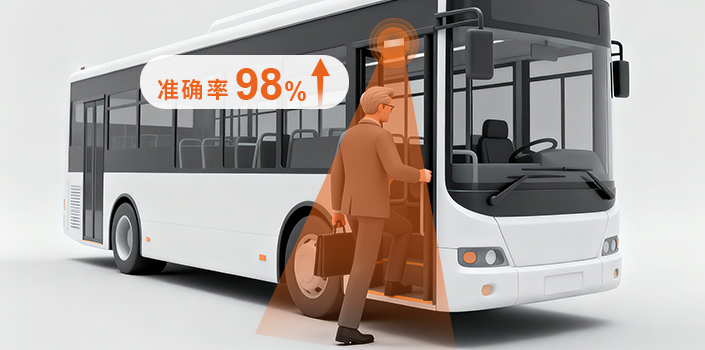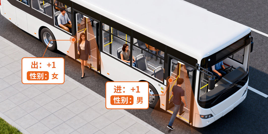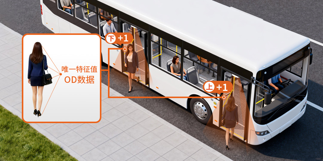 通过双目立体视觉 AI 传感器实时获取 3D 深度信息,基于头肩特征算法识别复杂场景中的乘客,并通过人体跟踪算法实现精准上下车数据统计,同时内置 AI 可采集性别信息