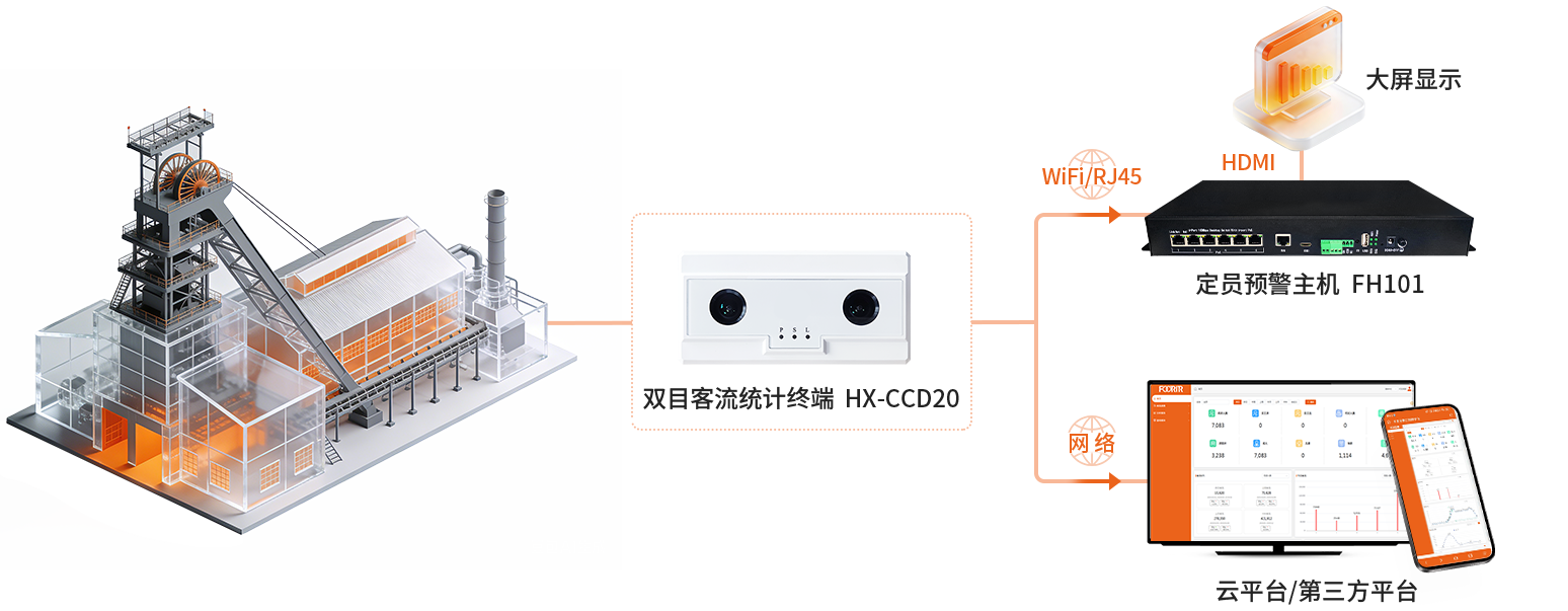 企业引入客流统计系统,结合定员预警主机与大屏显示,实现矿区安全管理、生产调度与运营优化的全面升级。